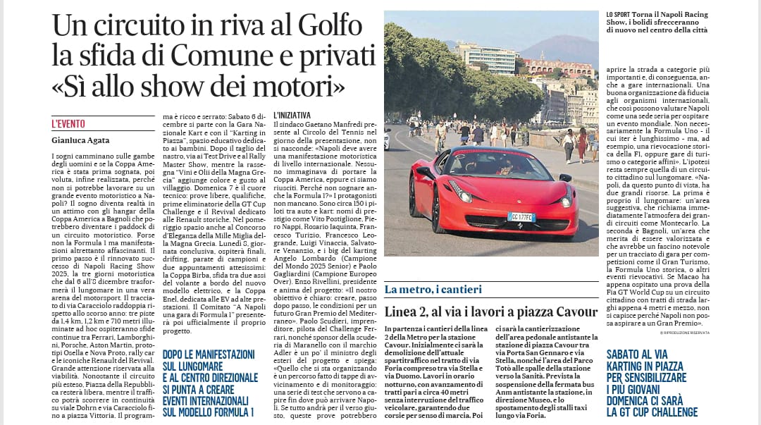 Il 12, 13, 14 Aprile 2024 si è svolta sul meraviglioso lungomare di Napoli, nell'ambito del 1° Napoli Racing Show il Trofeo Città di Napoli-Gran Premio di Napoli L'evento, organizzato dal Napoli Racing Show, ha riportato in città la passione delle competizioni motoristiche con l'obiettivo di ritornare ai fasti degli anni 60, quando il Gran Premio di Posillipo era l'unica competizione al mondo che, per glamour e notorietà, poteva competere con il Gran Premio di Montecarlo.